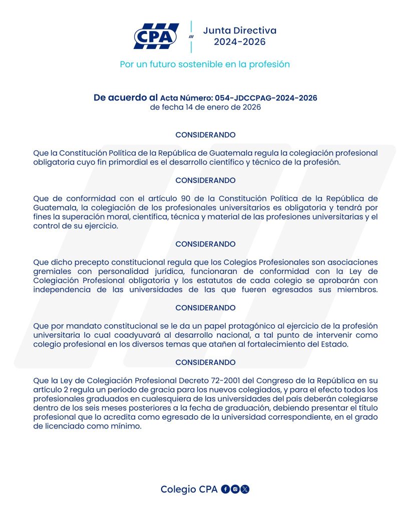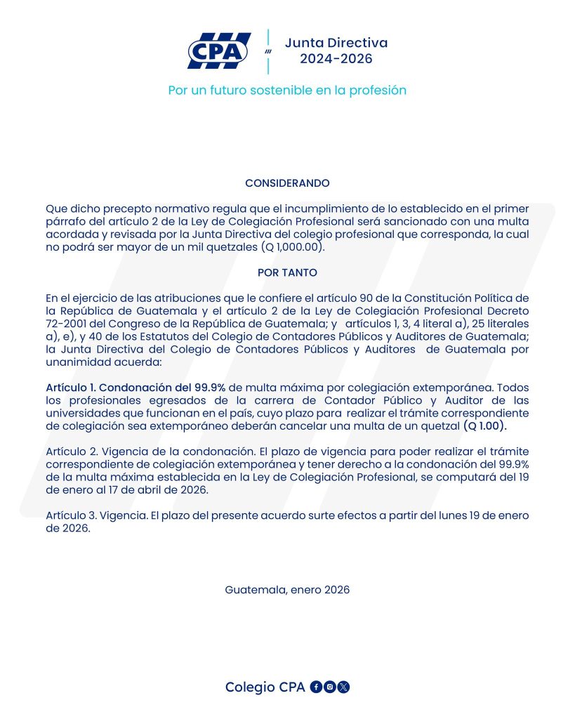La Junta Directiva 2024-2026 aprobó la condonación del 99.9% de la multa por colegiación tardía.