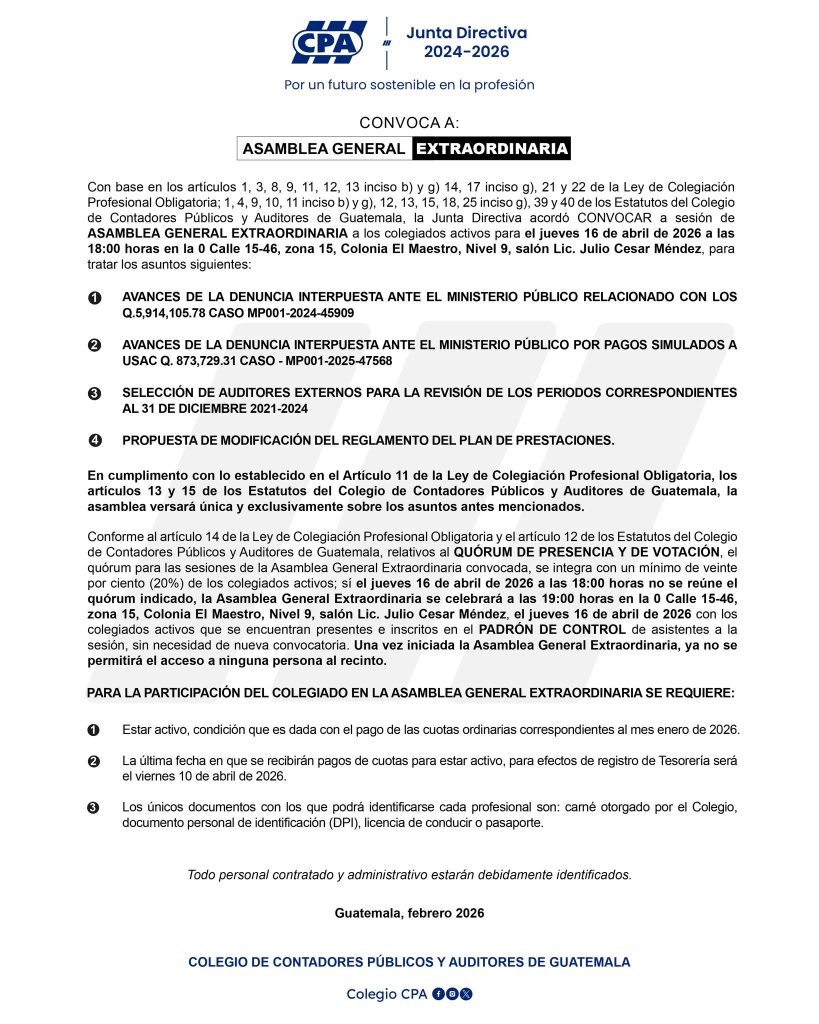 Jueves 16 de abril de 2026 a las 18:00 horas en la 0 calle 15-46, zona 15, Colonia El Maestro, nivel 9, salón Lic. Julio Cesa Méndez, Ciudad de Guatemala.